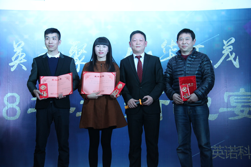 ▲五周年特別貢獻(xiàn)獎(jiǎng) 由董事長程總頒發(fā)證書及獎(jiǎng)金 授予榮譽(yù)人員:陳斌、林水英、程琥(從左至右排序)